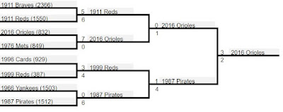 REGIONAL #53: Here's how the next "regional" in my endless single elimination tournament has shaped up going into the finals. Highlights have included 2016 Orioles' Chris Tillman easily outpitching Tom Seaver and the 1976 Mets; 1987 Pirates Doug Drabek shutting out the sorry swan song of the Mantle/Maris era 1966 Yankees; and injury replacement Caleb Joseph and his .174 batting average pulling off a successful squeeze play to "squeeze" the 2016 Orioles past the 1911 Reds 1-0 in the semifinals, relief ace Zack Britton getting the win in relief. The two surviving teams are interesting ones: The entire starting lineup for the 89-win Orioles has an "E" stealing rating (not sure I remember seeing that before), while the Bonds/Bonilla-led Pirates handled the regional favorite 1999 Reds in the semifinals and seem to me like a better team than their 80-82 record would indicate.